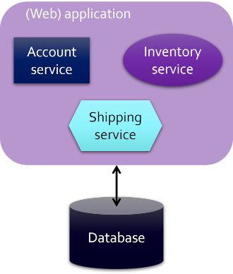 This is an example of an application. The word “web” is in brackets because these applications tend to be “classic” desktop applications, though they can also be web apps. The point is that all services (account, inventory, shipping) are in the same code base and are typically connected to a central database. The code base is generally complex and difficult to understand, and the services are not sufficiently separated.