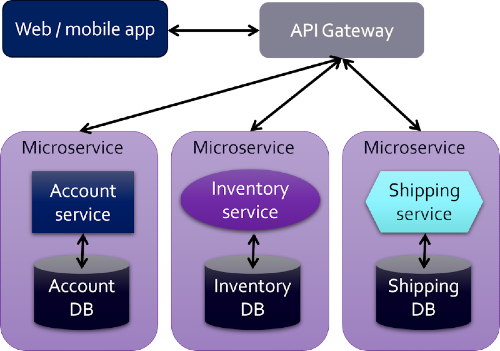 The most crucial difference is that the application's services (account, inventory, and shipping) are moved to separate entities called microservices, each using its own database. Multiple frontends, like web and mobile applications, can exist, and a desktop application is also possible. A new, optional component named the API gateway acts as the primary proxy, responsible for connecting the frontends to the services and performing other vital functions such as collecting metrics, handling authentication and authorization, transforming data structures, and validating input. If multiple frontends exist (such as a web app and a mobile app), there may be another optional component called Backend For Frontend (BFF) that is responsible for formatting and aggregating data from the services.