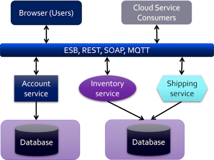 The differences between this and the microservices architecture version are significant, if not ground-breaking. The services can share a database, and a central infrastructure component (ESB, REST, SOAP, or MQTT) connects the components. The clients can be users (from browsers, mobile, or desktop apps) or other cloud service consumers.